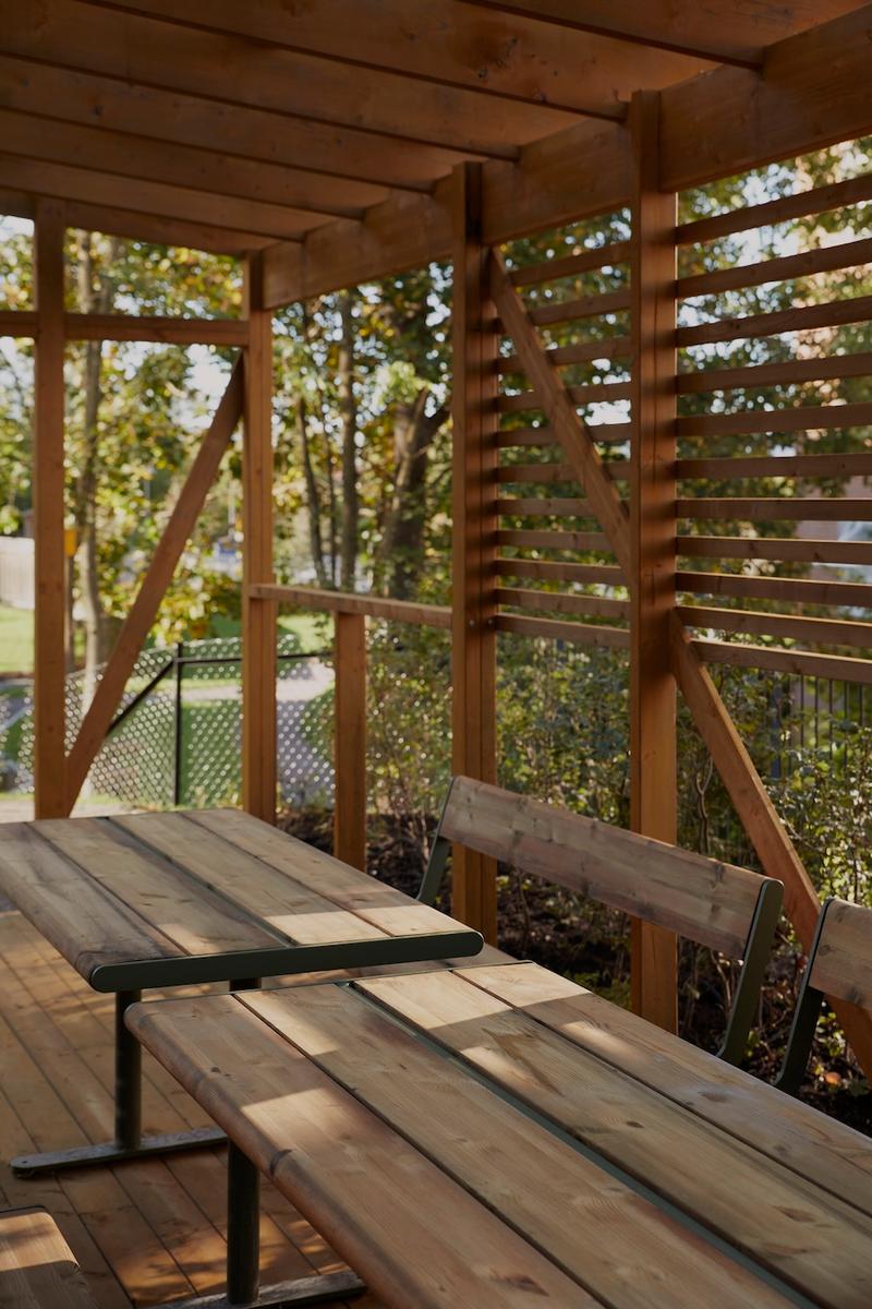 Den vestlige delen av tomten, med et felles uteområde i grønne omgivelser. Her finner man en pergola med utekjøkken, et drivhus, lekeplass, petanquebane og sjakkbord – alt tilrettelagt for sosialt samvær på tvers av generasjoner.
