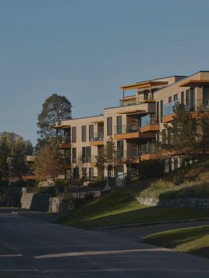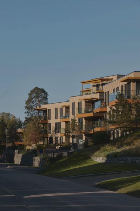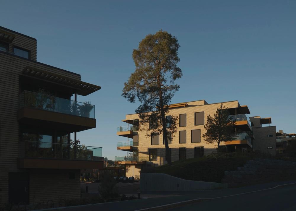 På en kolle over Gjønnes t-banestasjon er det bygget flotte leiligheter omkranset av grønne uteområder med høy materialkvalitet.