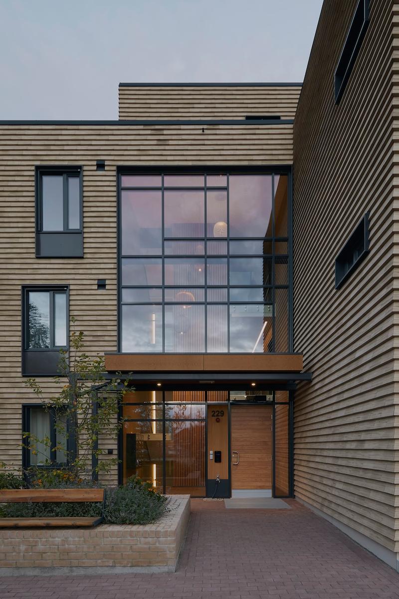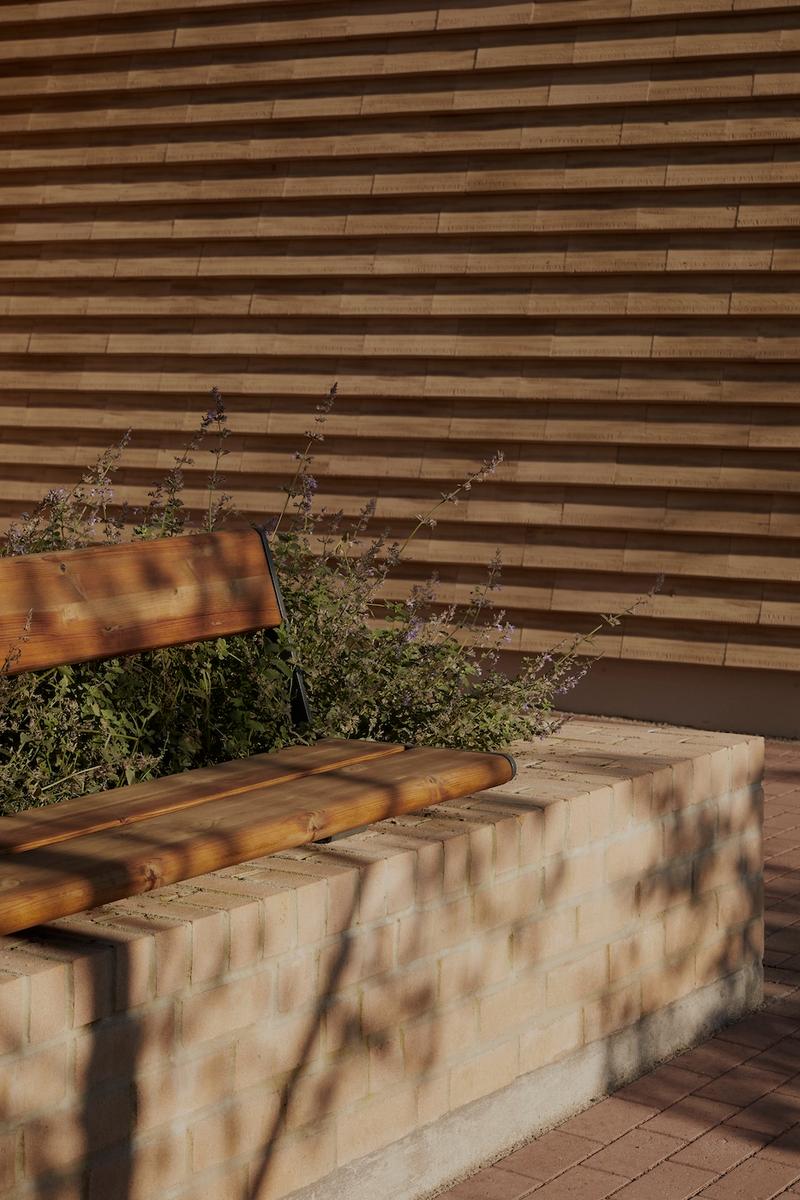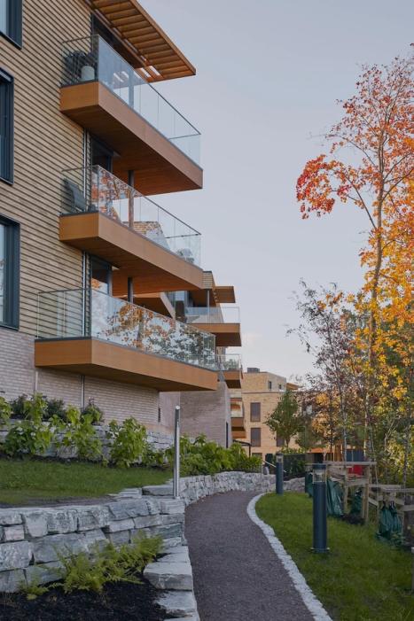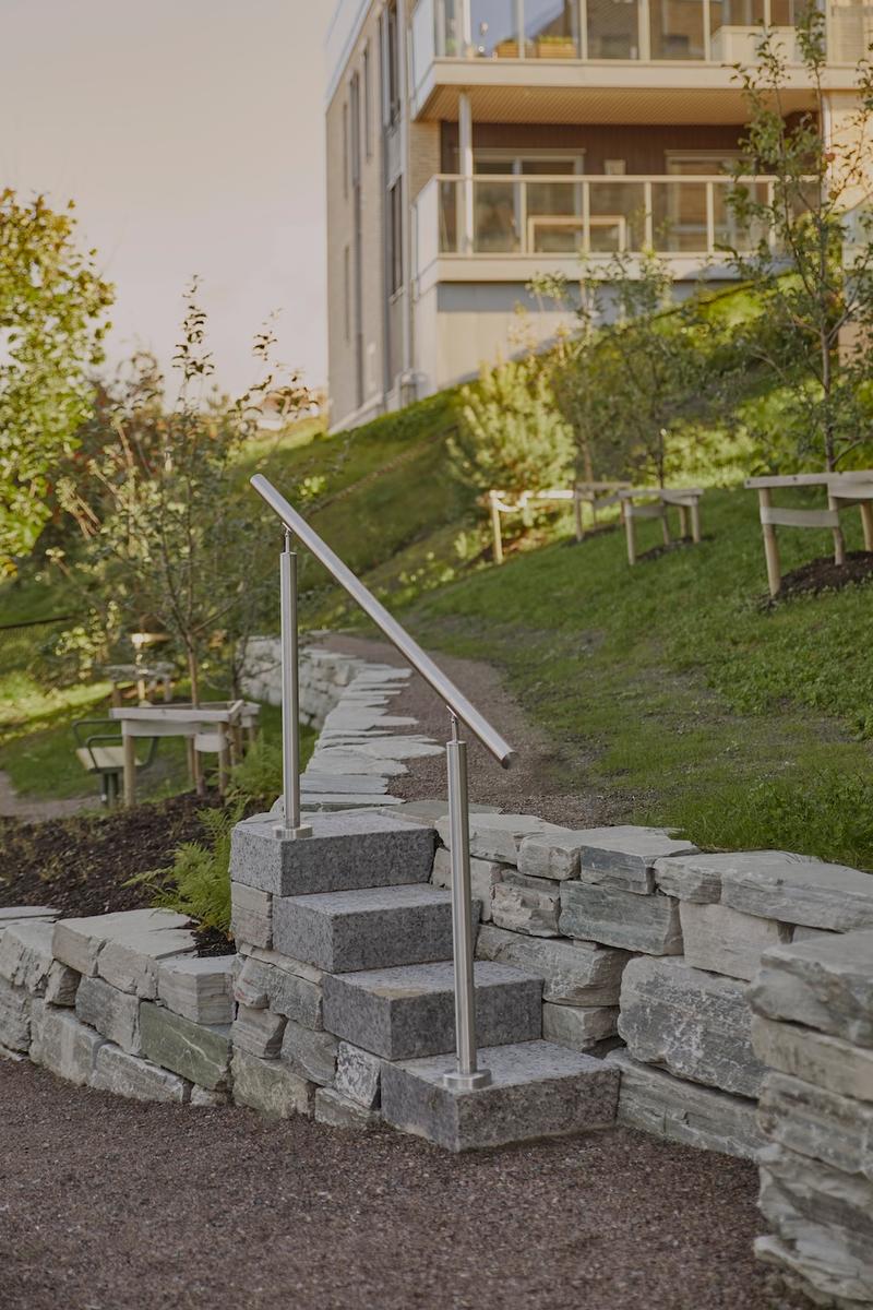 En tursti strekker seg opp gjennom området og er tilgjengelig for hele nabolaget. Langs stien er den bratte skråningen forsiktig terrassert med skifermurer i Oppdal skifer. De eksisterende trærne på vestsiden bevart, sammen med et majestetisk furutre. Nye store trær i utearealene gir en grønn ramme og utsikt til grønt fra alle leilighetene.