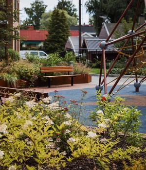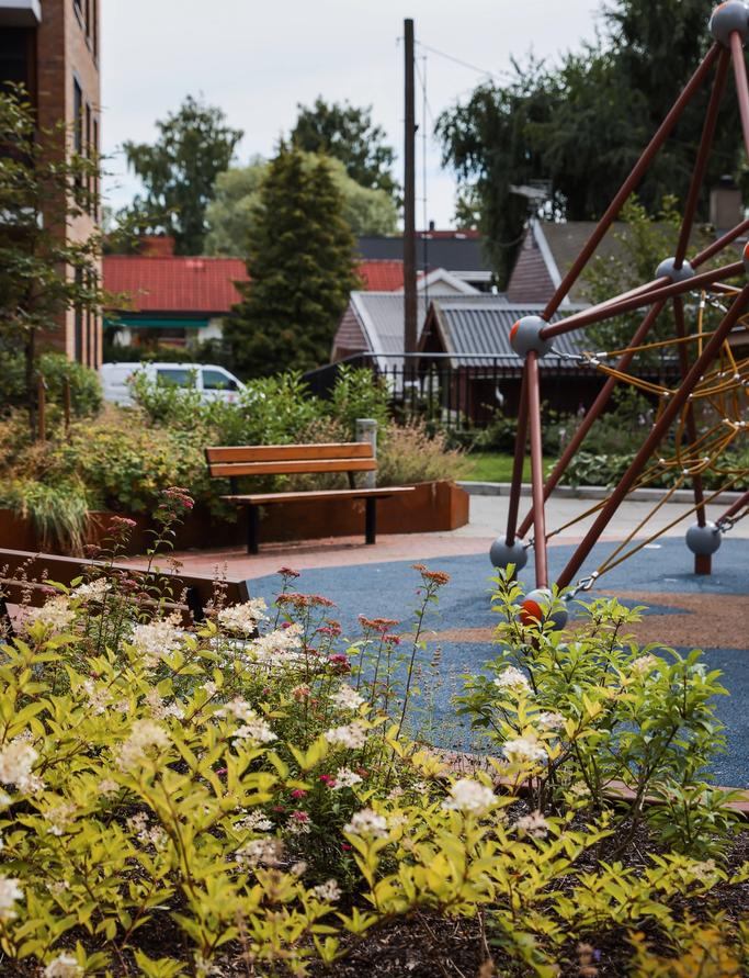 Gårdsrommet åpner seg mot torget gjennom trapperommet. I gårdsrommet er det frodig vegetasjon og et spennende lekeapparat som attraksjonselement.