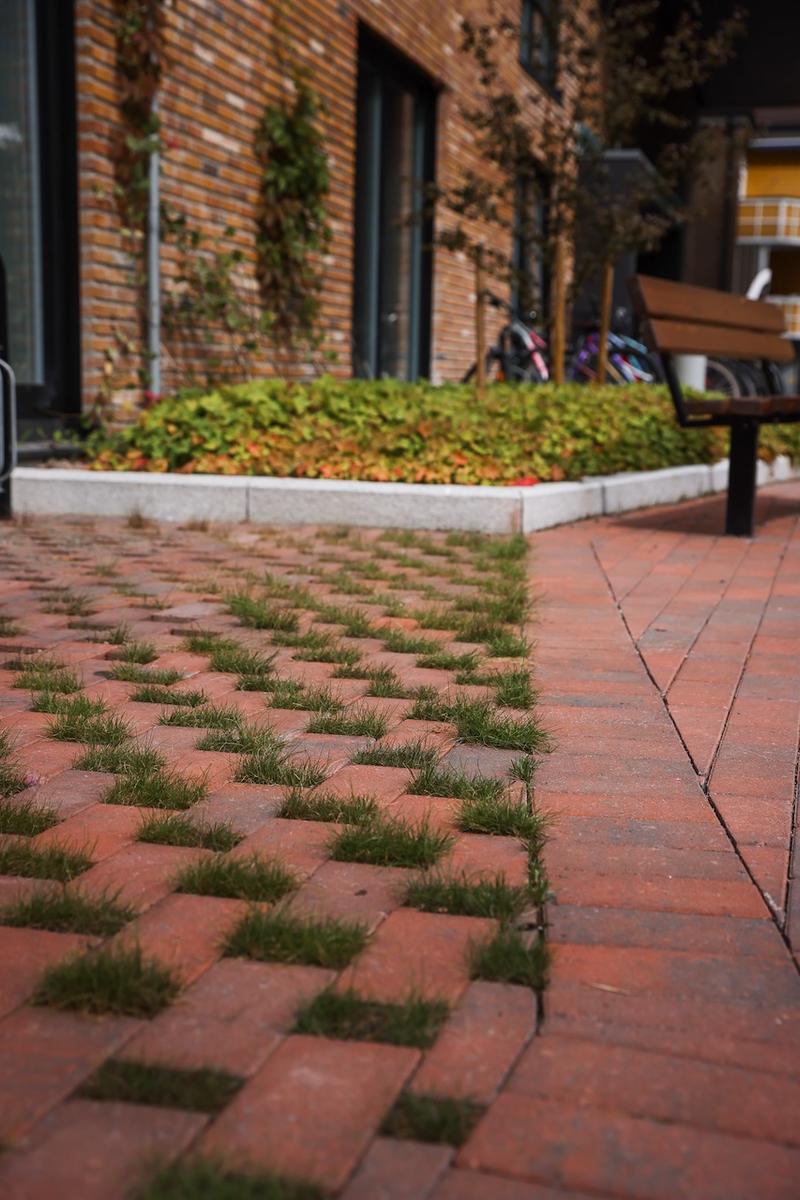 Takene er etablert som en kombinasjon av grønne tak og takterrasser. Materialpalletten er granittheller, rød belegningsstein og cortenstål.
