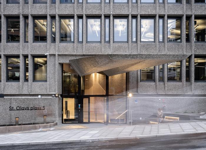 St. Olavs plass 5 er tegnet av arkitekt Erling Viksjø og er oppført på Byantikvarens liste over bevaringsverdige bygninger. Bygget har blitt modernisert med en ekstra kontoretasje og mer utadrettet virksomhet. Hovedinngangen er bygget om og har blitt mer synlig og attraktiv i gatebildet med trappeamfi med lyssatte sitteflater og plantefelt. Triangelformen i grunnplanet er gjentatt i et spesialutformet signaturbelegg som er satt sammen av to typer Ottaskifer og en rød polert granitt.