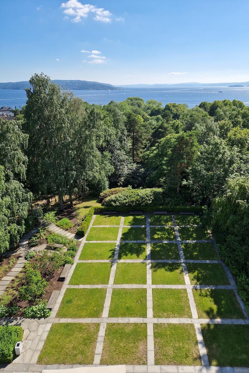 Utearealene omfatter blant annet en gammel lindeallé, klipte hekker og store felt med stauder og løkblomster. I tillegg kommer vedlikehold og drift av faste skiferdekker, grusstier og basseng.
